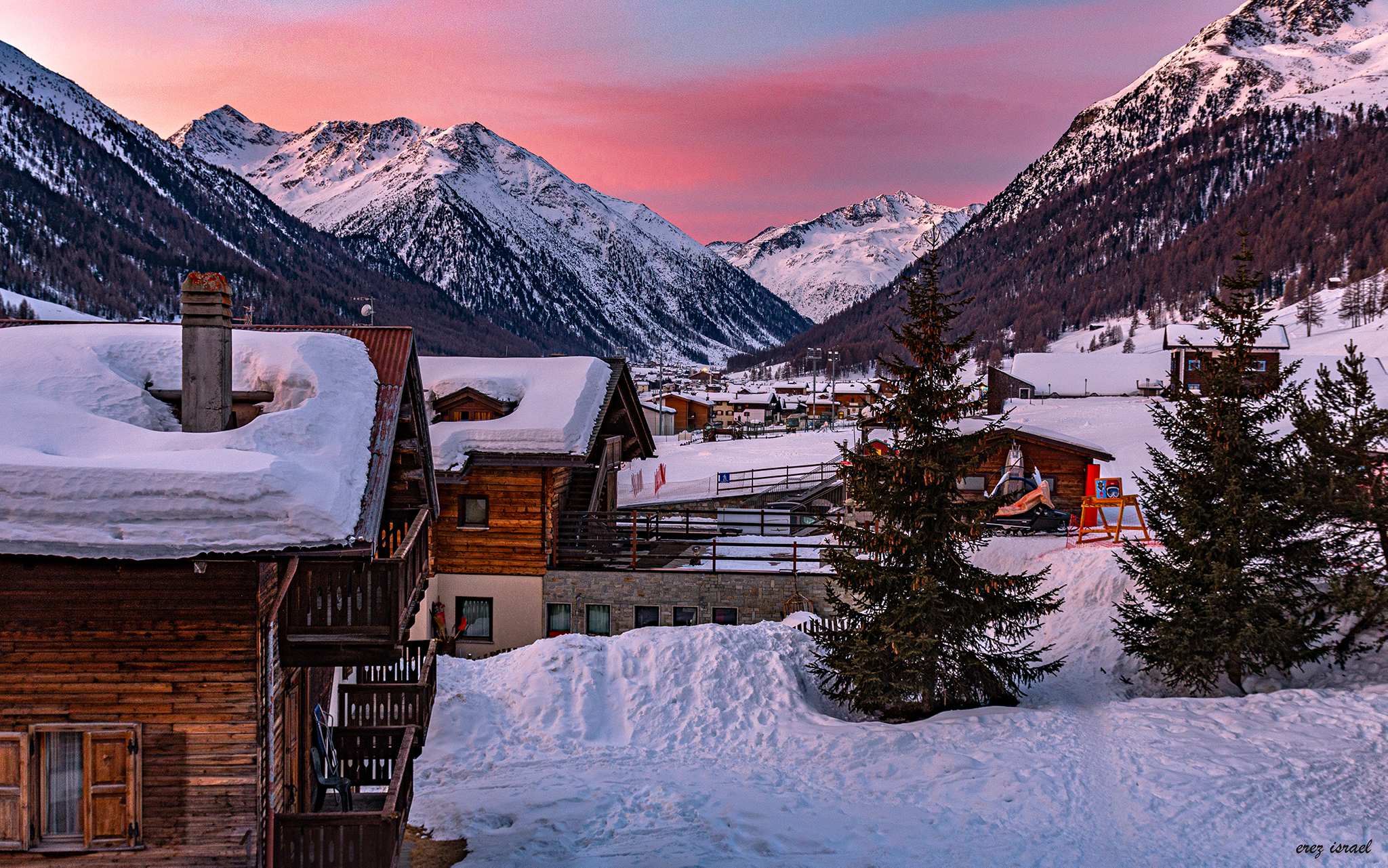 הרי האלפים המושלגים מתעוררים לזריחה אדומה בצפון איטליה