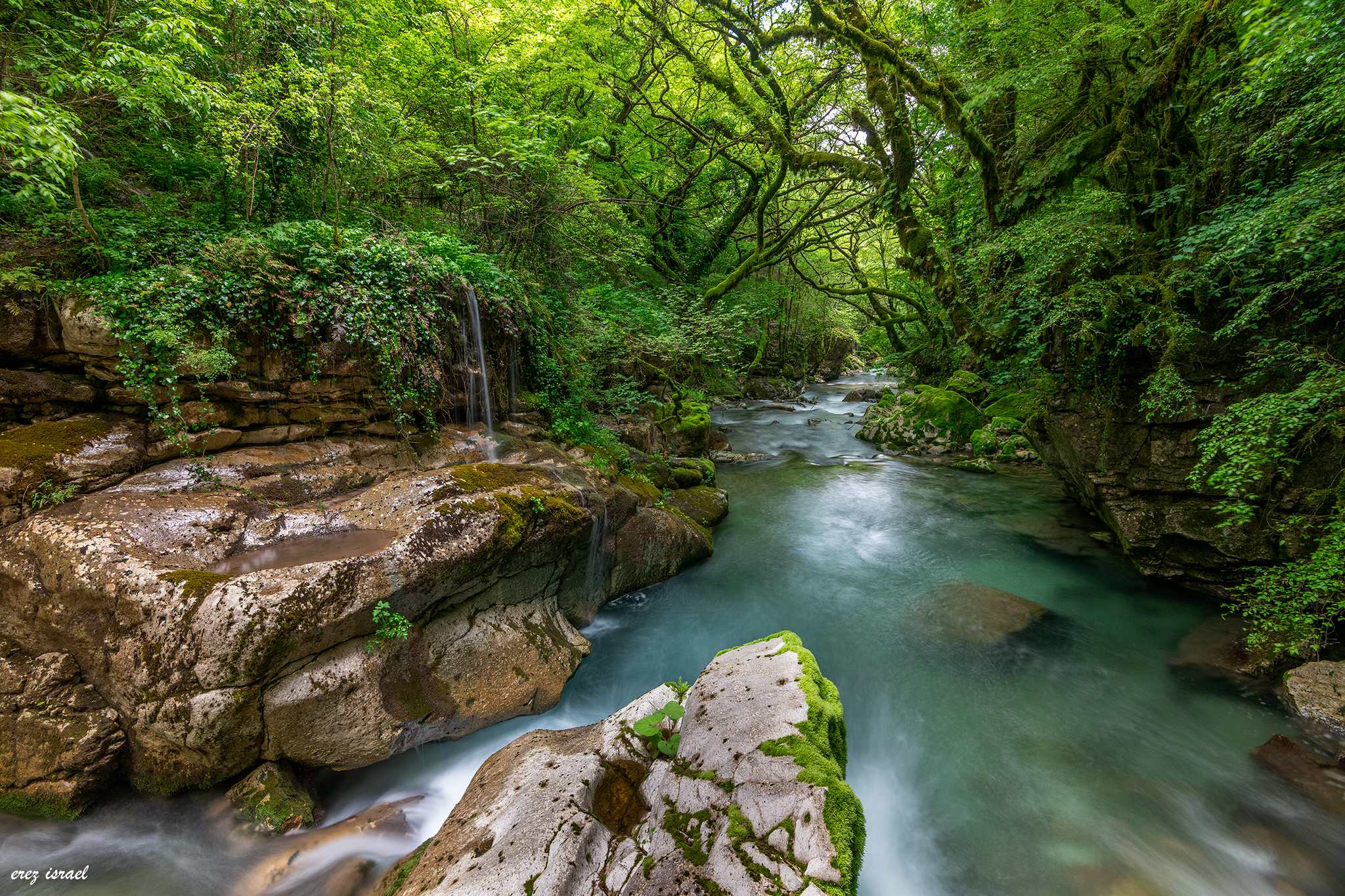 זרימה של מי השלגים והגשמים במעטה ירוק עז ורענן של תחילת האביב , יוון