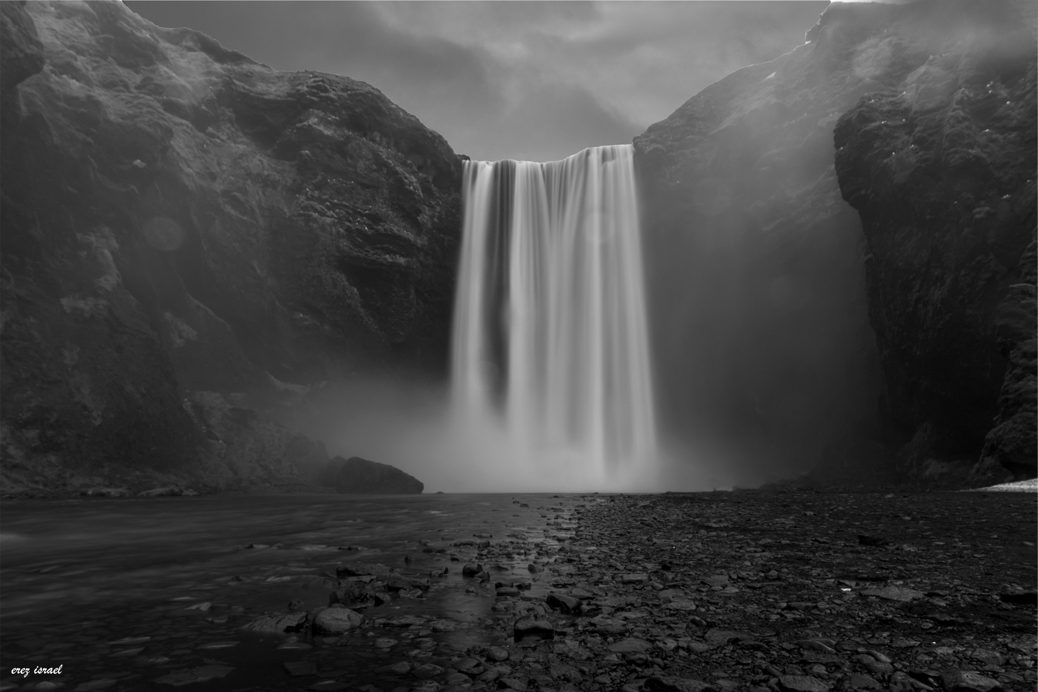 חוטים לבנים הנופלים על סלעי הבזלת ,איסלנד